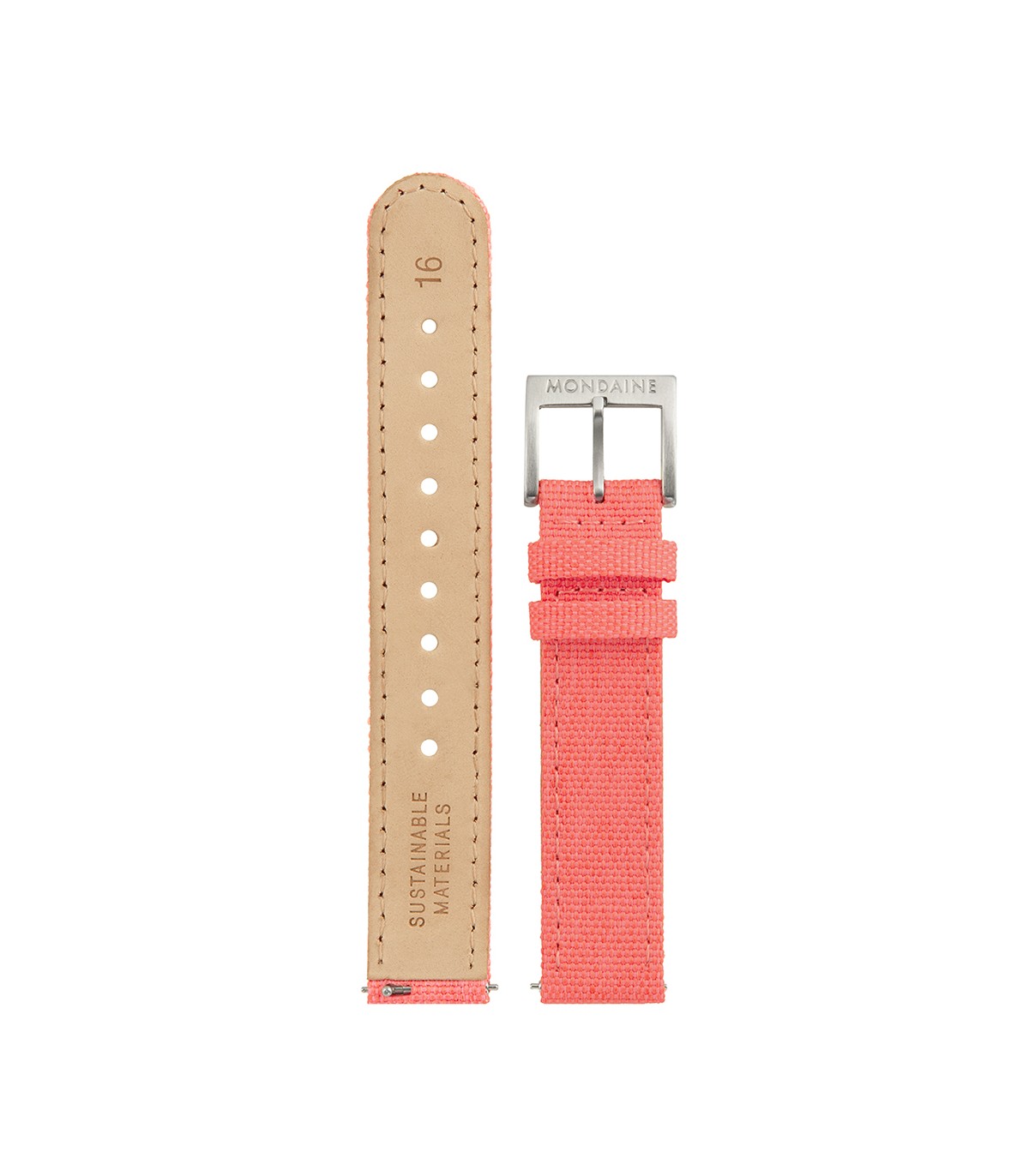 - Cinturino easyclick realizzato con fibre di tessuto, rivestimento interno in nabuk, fibbia con ardiglione e logo Mondaine