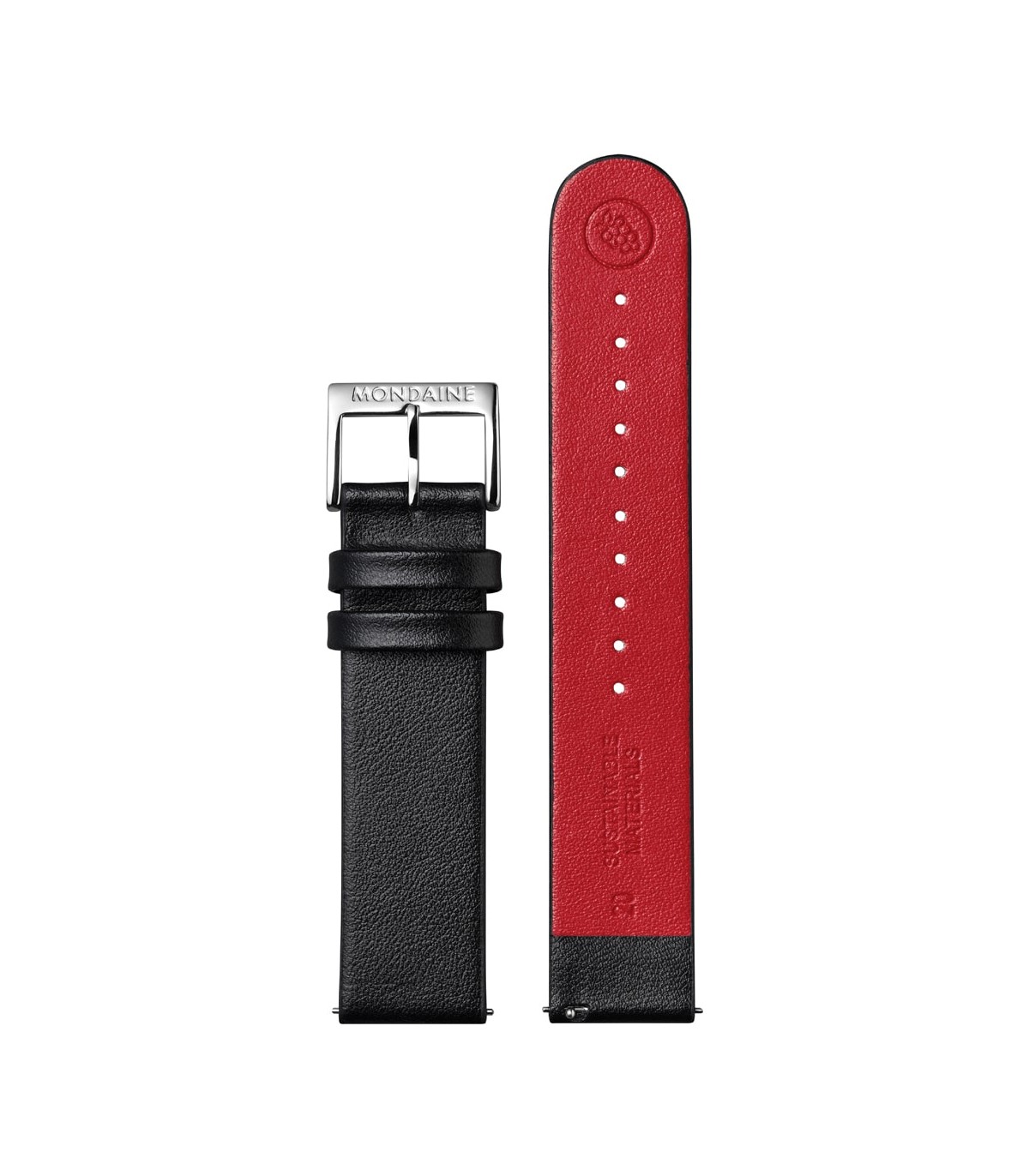 Cinturino Mondaine 20mm Nero in ecopelle Vegea® vegana con interno rosso e fibbia lucida