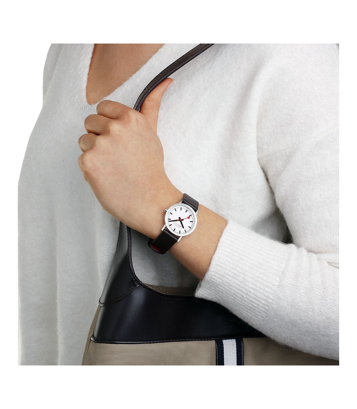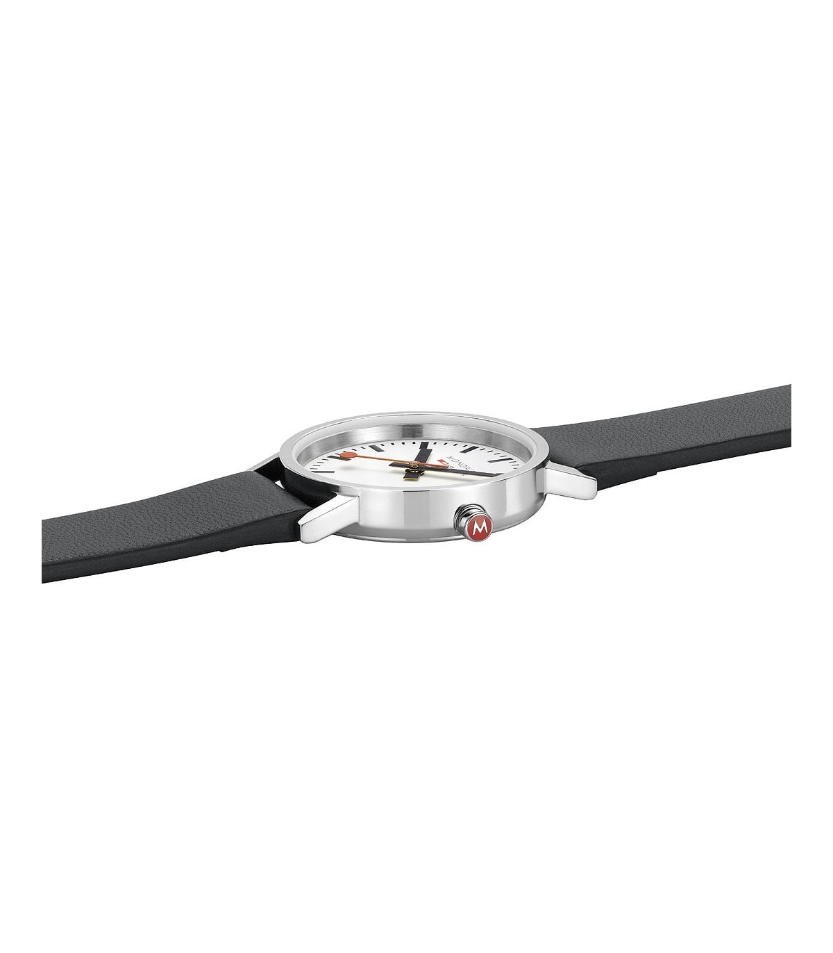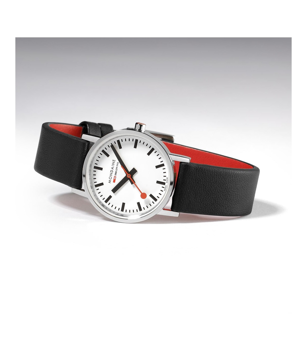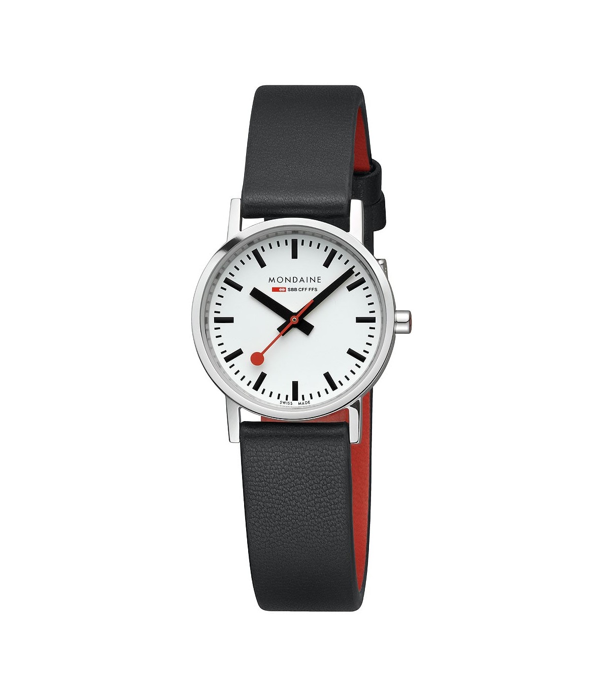 Questo modello riprende il primo orologio da polso Mondaine che ha portato al polso il celebre design delle stazioni ferroviarie svizzere: il quadrante bianco, pulito ed essenziale, è caratterizzato da indici neri ben marcati e dall’inconfondibile lancetta dei secondi con paletta rossa, ispirata alla segnaletica dei capostazione. Il risultato è una leggibilità immediata e intuitiva.