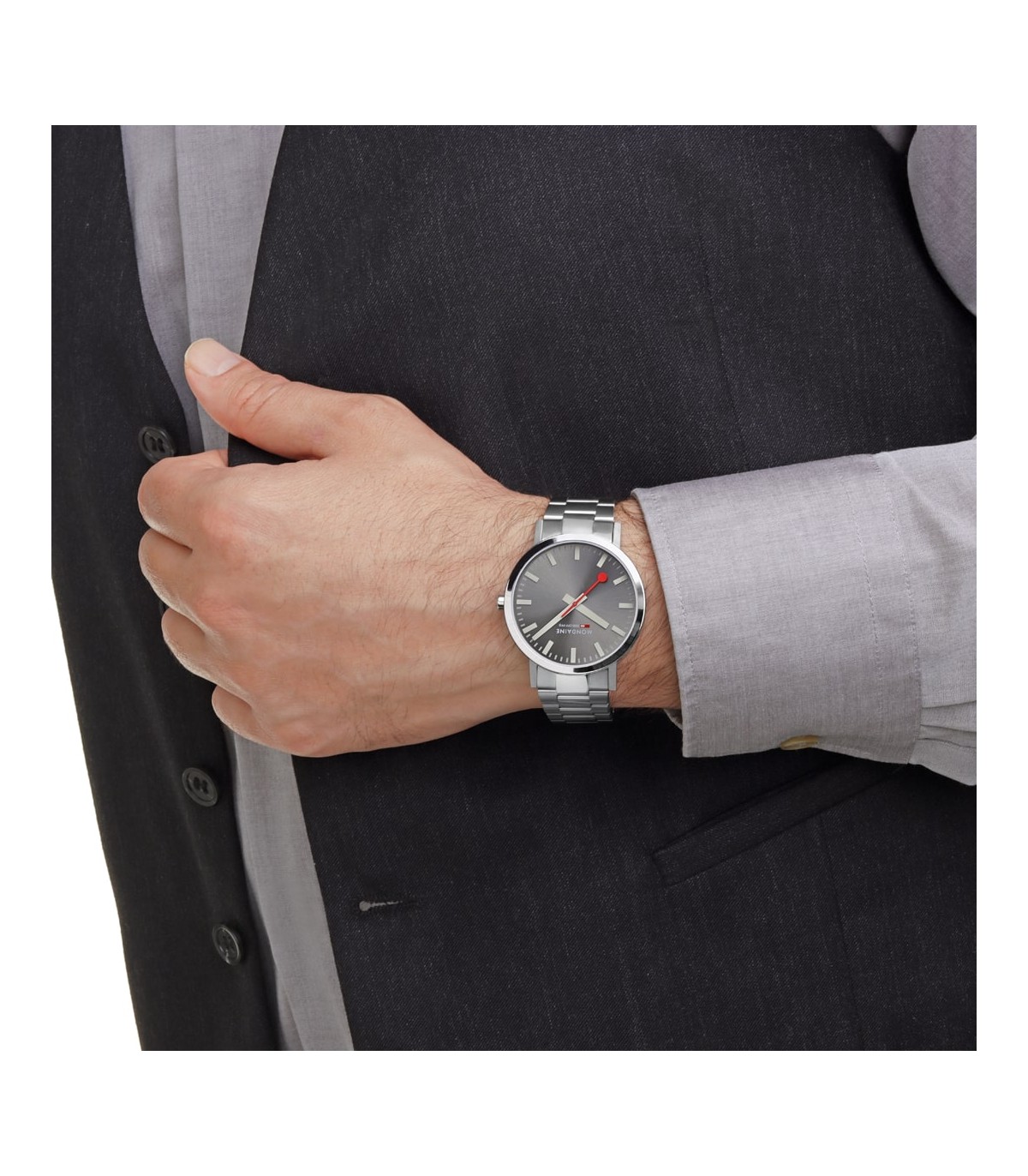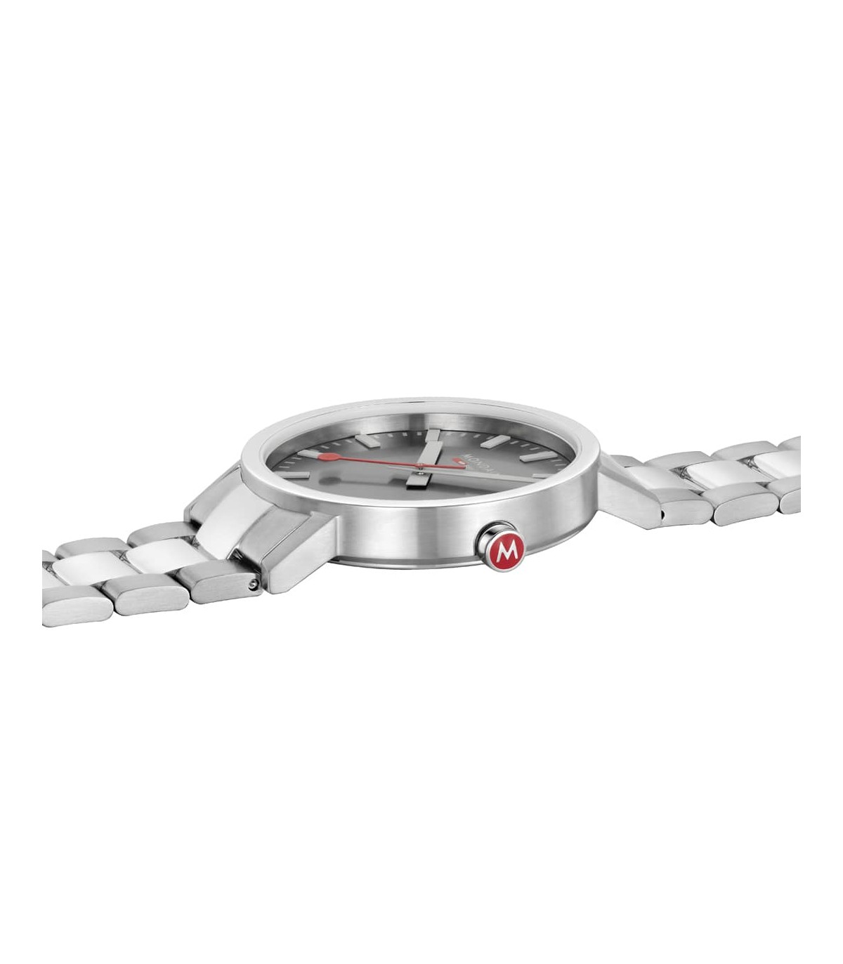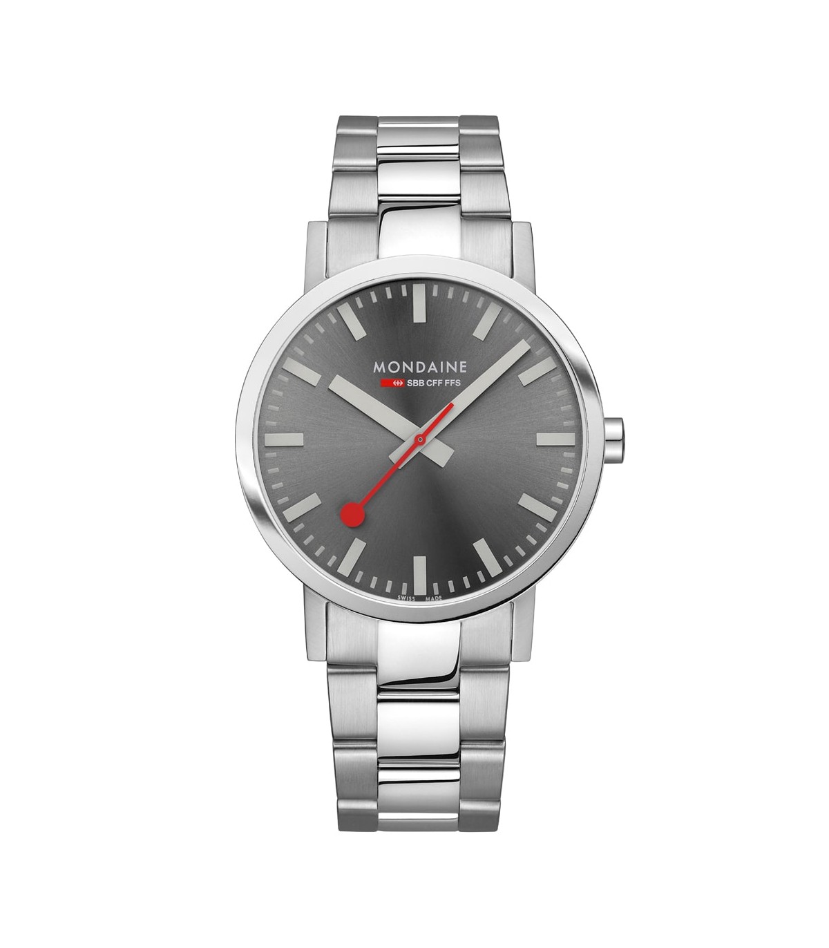 Il quadrante grigio con finitura sunray dona profondità e riflessi raffinati, creando un elegante contrasto con gli indici chiari e con l’inconfondibile lancetta dei secondi con paletta rossa, firma distintiva Mondaine. Il design essenziale garantisce una leggibilità immediata e perfetta in ogni situazione.