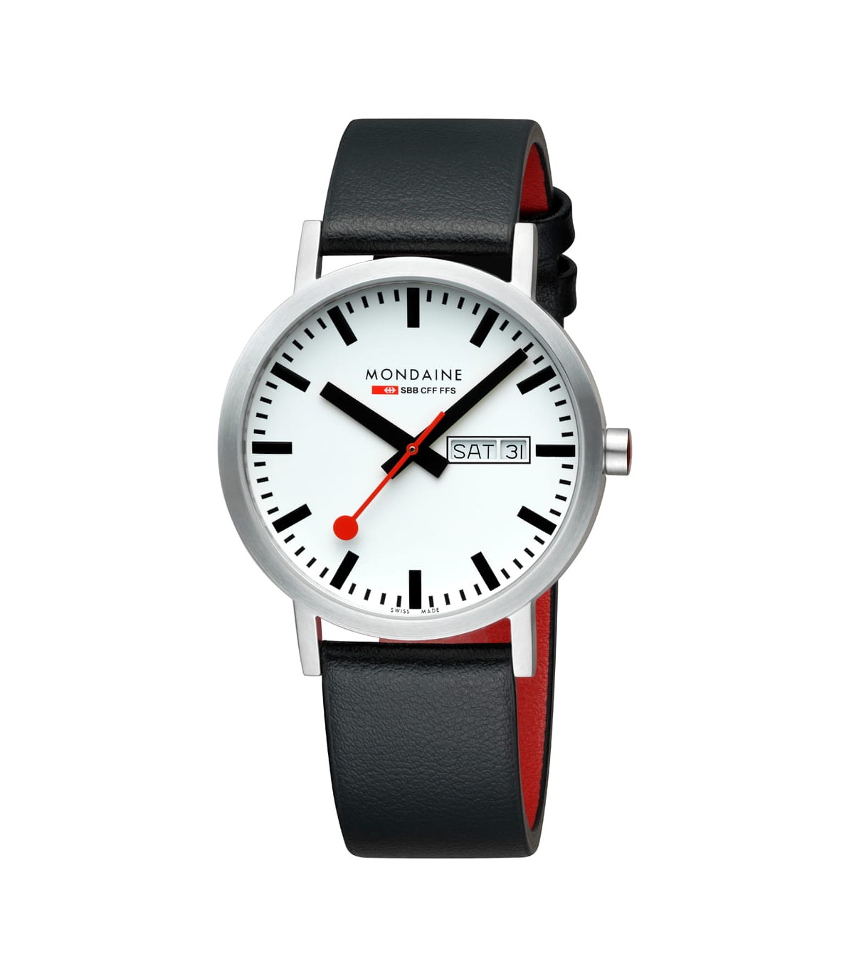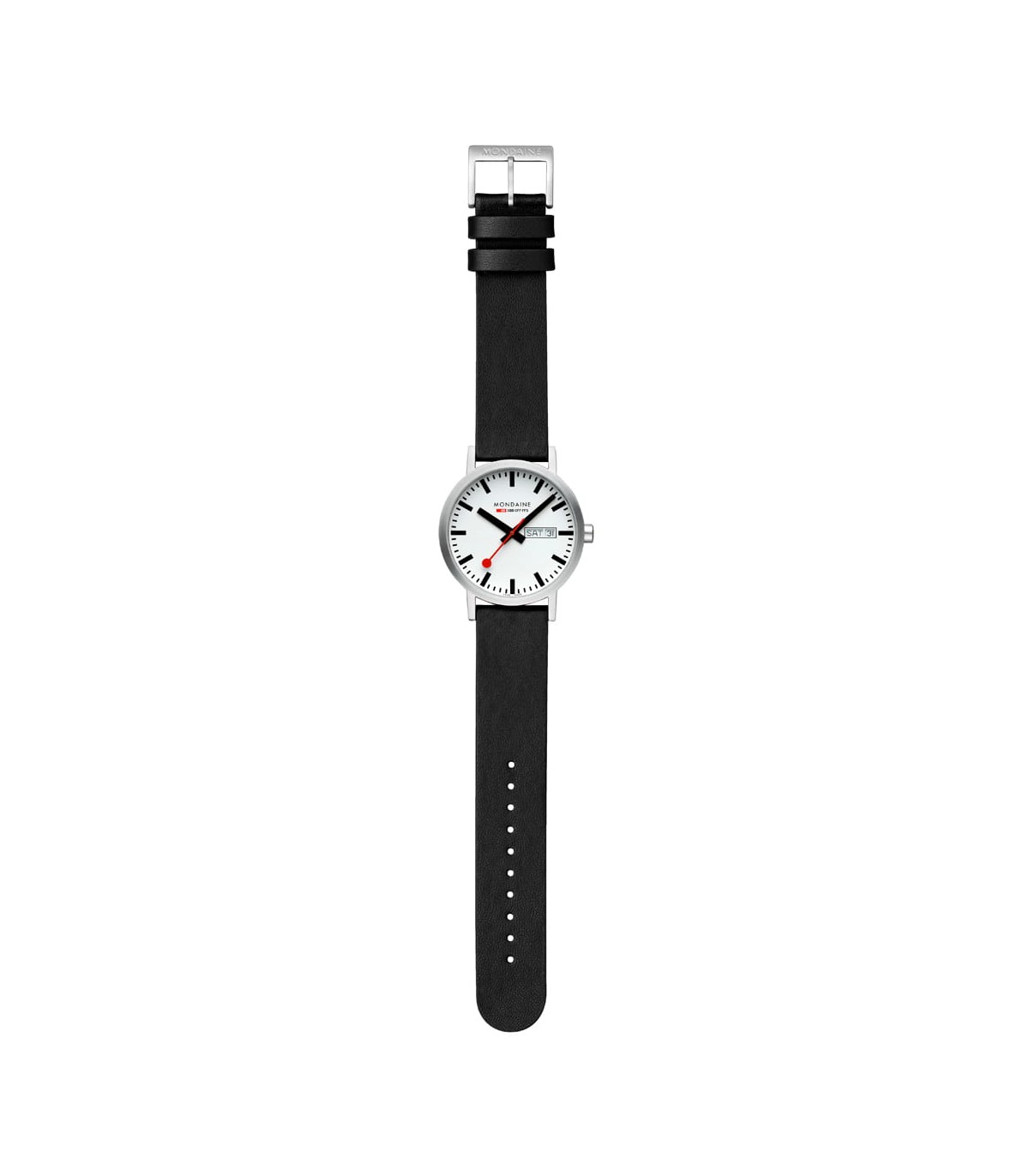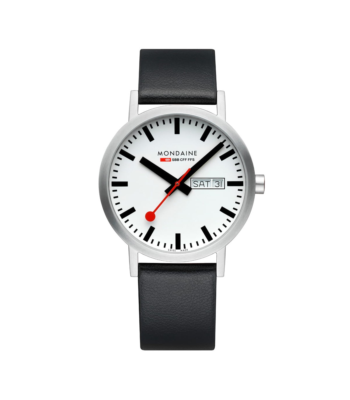Mondaine Classic Day-Date 40 mm presenta un elegante quadrante bianco con indici neri ben visibili e l'iconica lancetta dei secondi rossa Mondaine. Il calendario giorno-data a ore 3 garantisce una lettura immediata e aggiunge funzionalità al design minimalista.