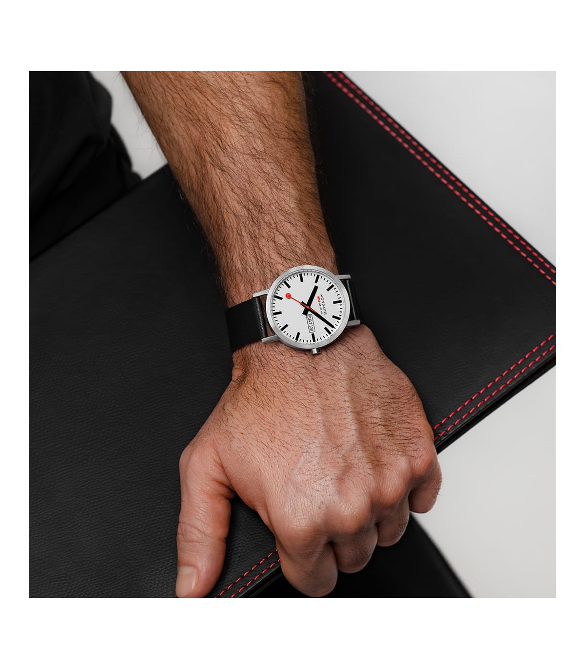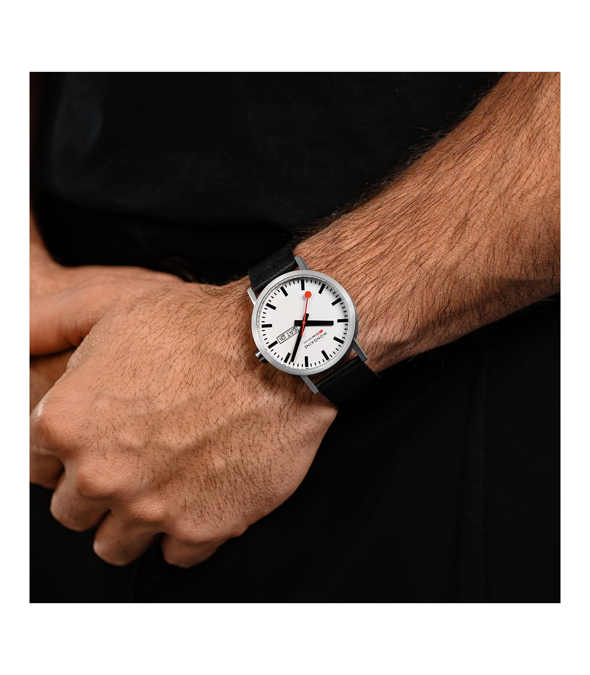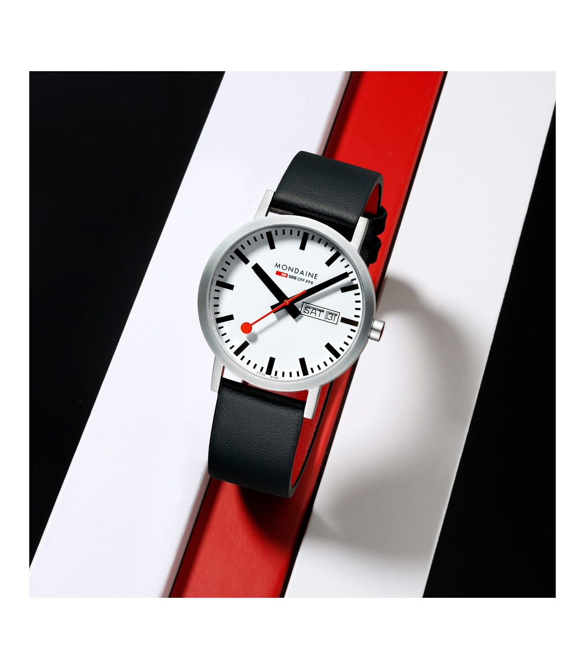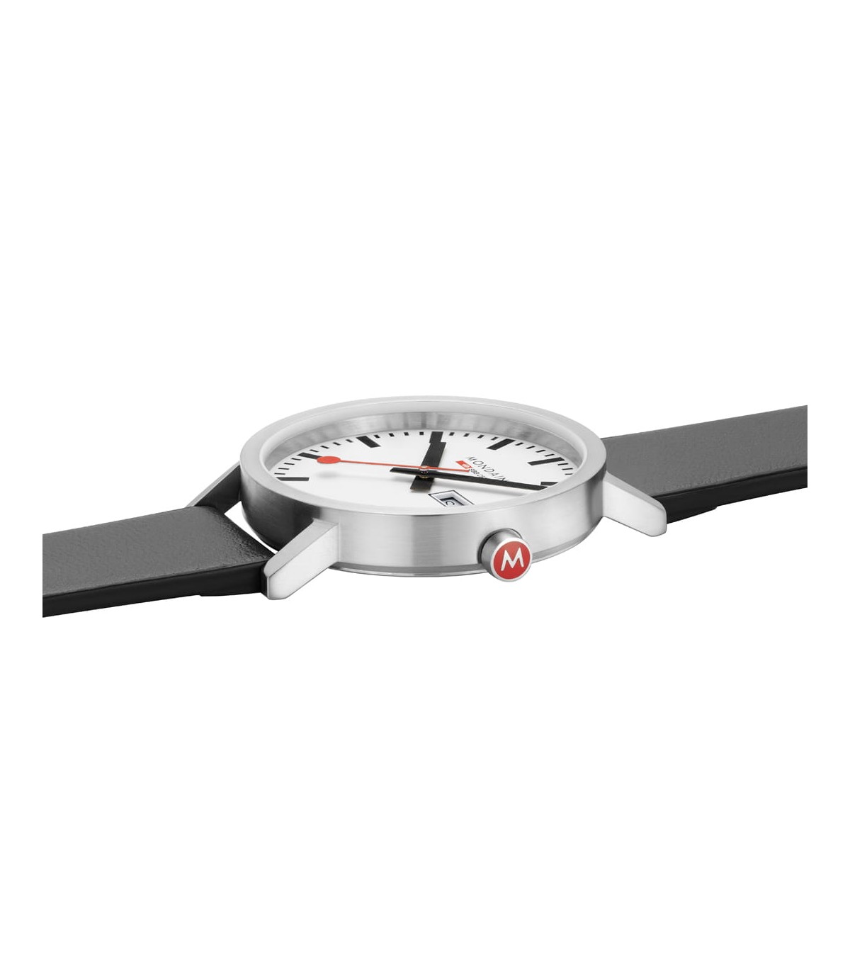 Mondaine Classic Day-Date 40 mm presenta un elegante quadrante bianco con indici neri ben visibili e l'iconica lancetta dei secondi rossa Mondaine. Il calendario giorno-data a ore 3 garantisce una lettura immediata e aggiunge funzionalità al design minimalista.