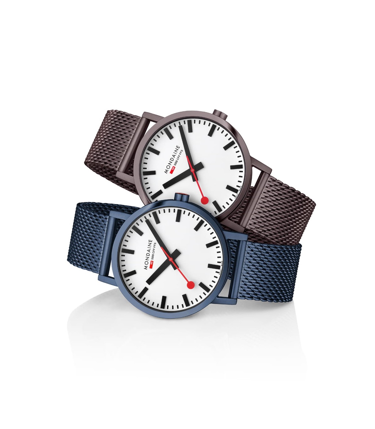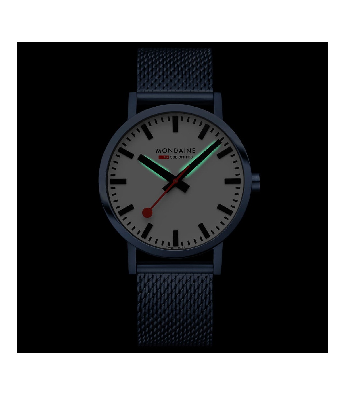 Mondaine Classic 40 mm IP Blue è racchiuso in una cassa in acciaio satinato con ghiera lucida, unisce resistenza e eleganza Swiss Made. Il quadrante bianco minimalista, con indici neri e l'iconica lancetta rossa Mondaine, crea un raffinato contrasto con il cinturino mesh IP Blue.