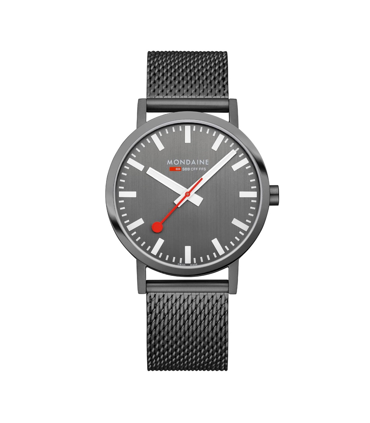 Il quadrante scuro crea un raffinato contrasto con gli indici ben definiti e con l’inconfondibile lancetta dei secondi rossa Mondaine, assicurando una leggibilità immediata in ogni situazione.