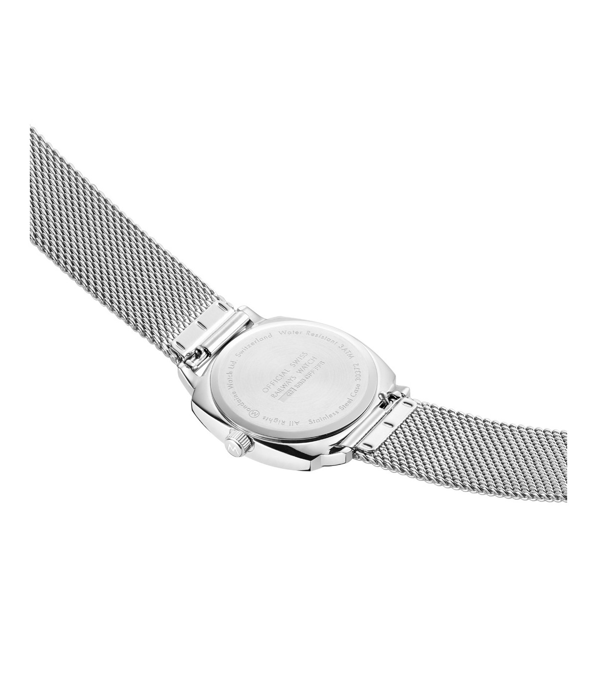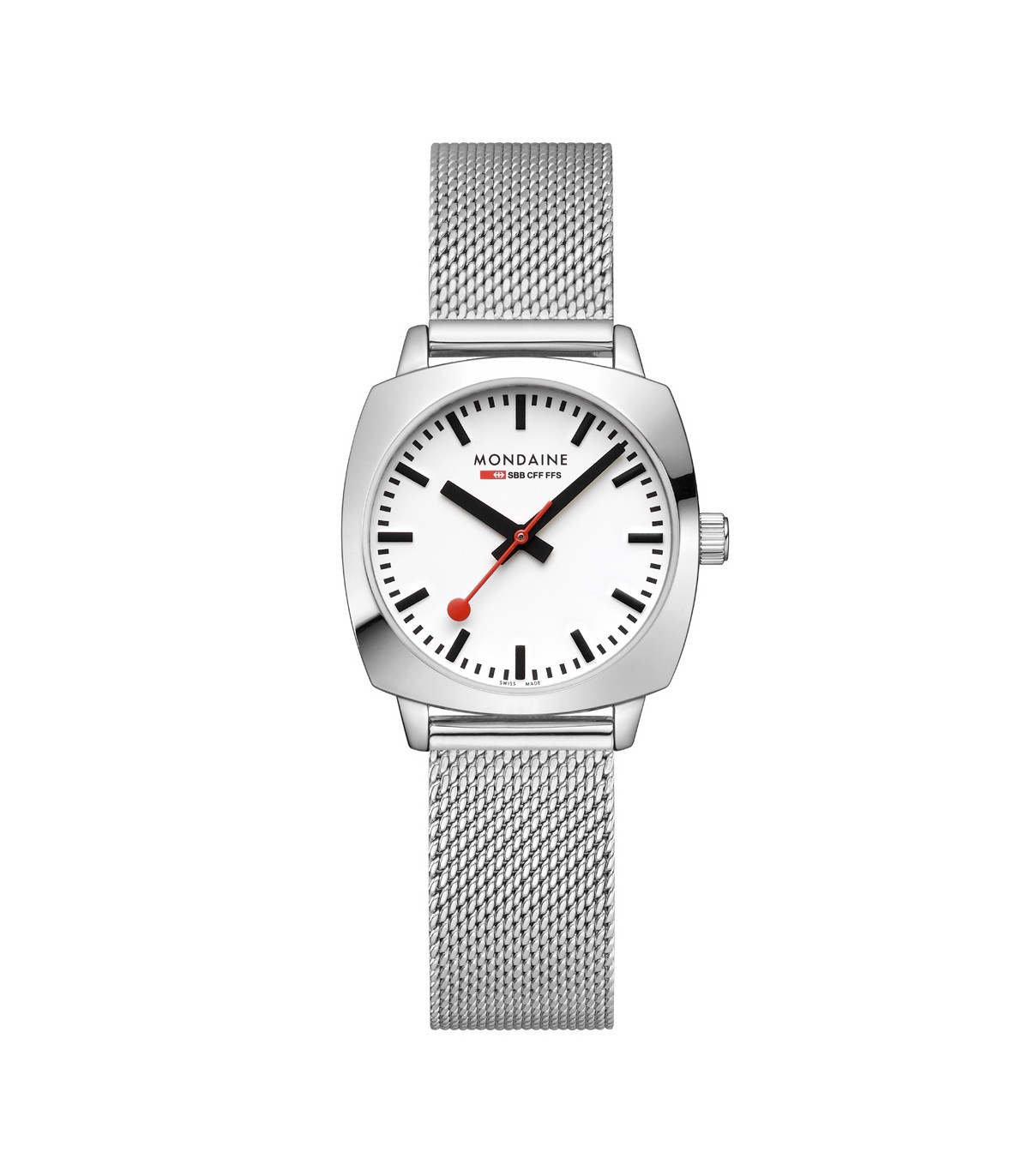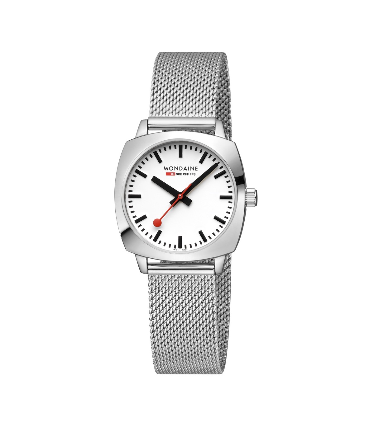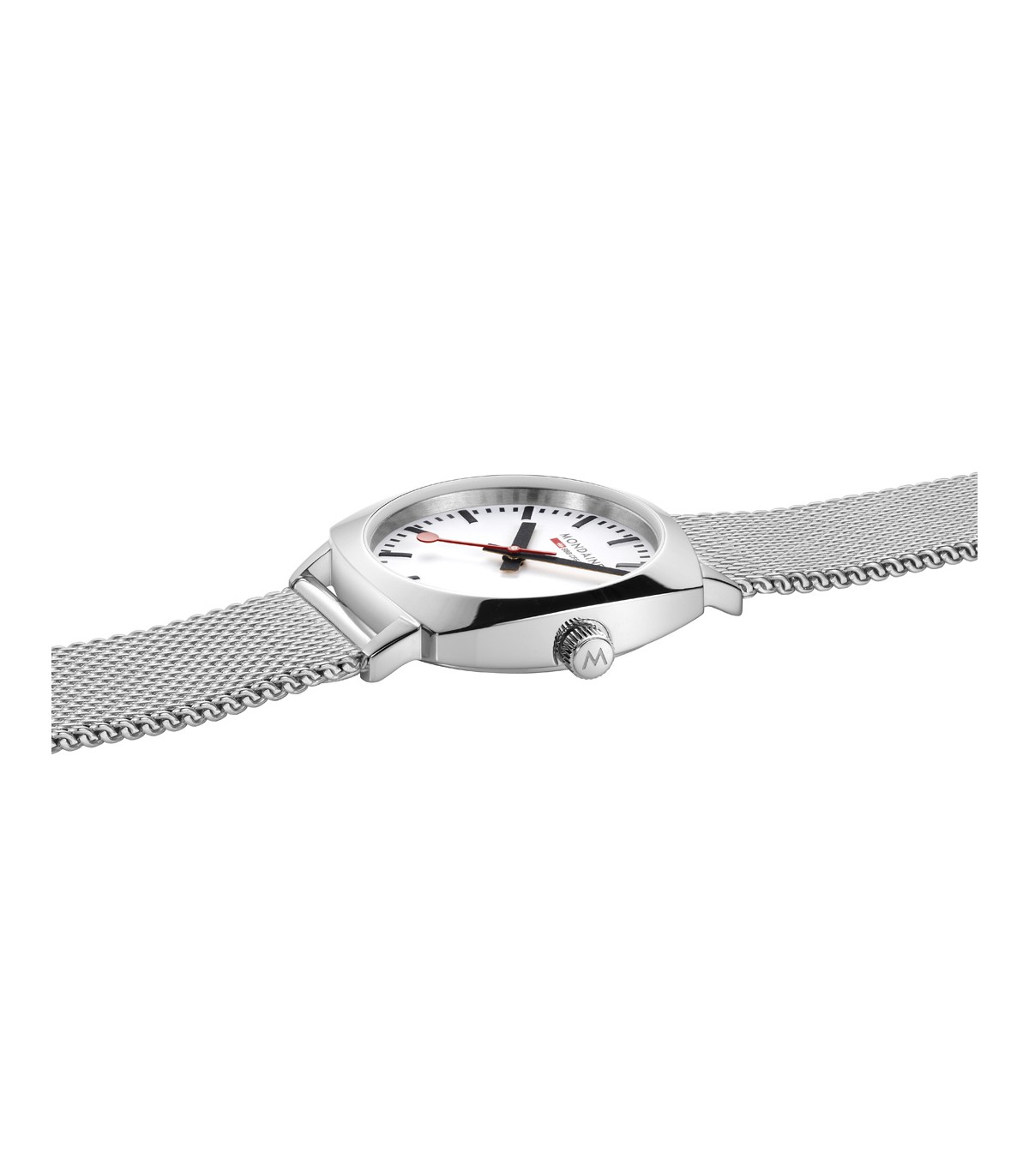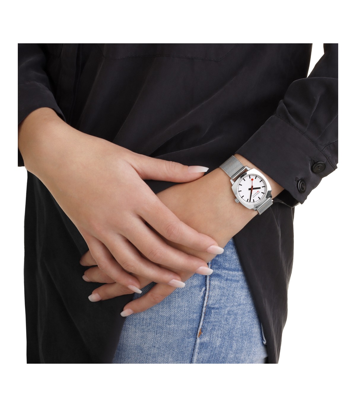 La cassa in acciaio inossidabile di 31 mm si adatta elegantemente ai polsi più piccoli. Il classico quadrante bianco è abbinato perfettamente a un bracciale maglia milanese.